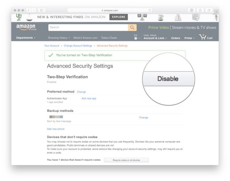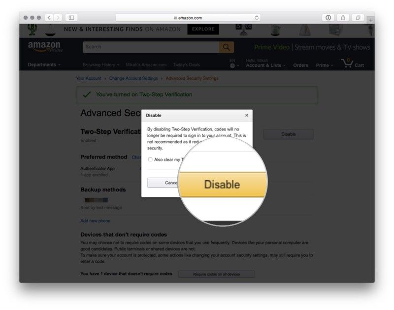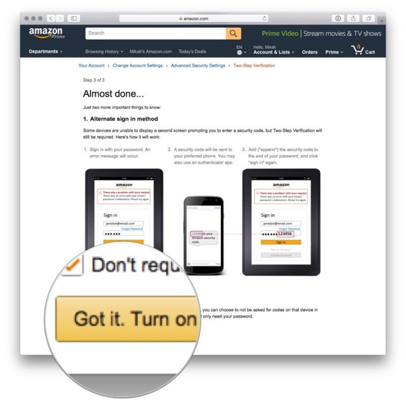 Нажмите Понял. Включить двухэтапную проверку после прочтения об альтернативном методе входа в Amazon.