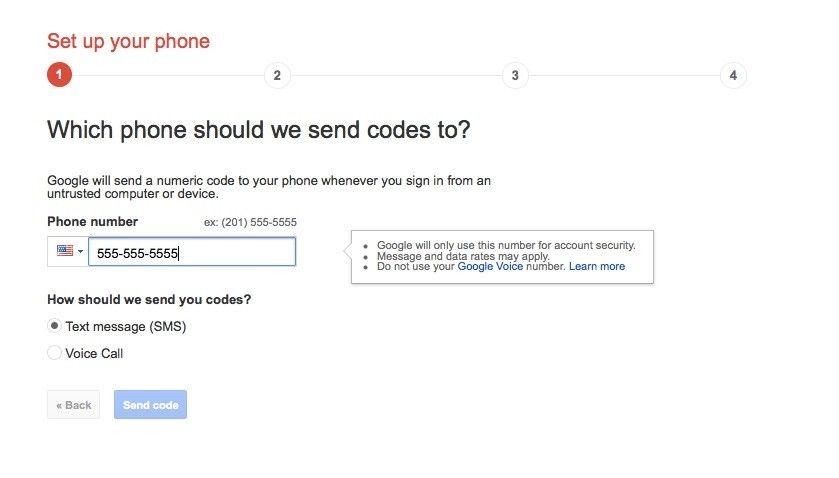 - Добавьте номер телефона, на который Google может отправить шестизначный код подтверждения. (По непонятным причинам это не должен быть ваш номер Google Voice: если вы используете этот номер телефона, вы можете оказаться заблокированным из своей учетной записи.)