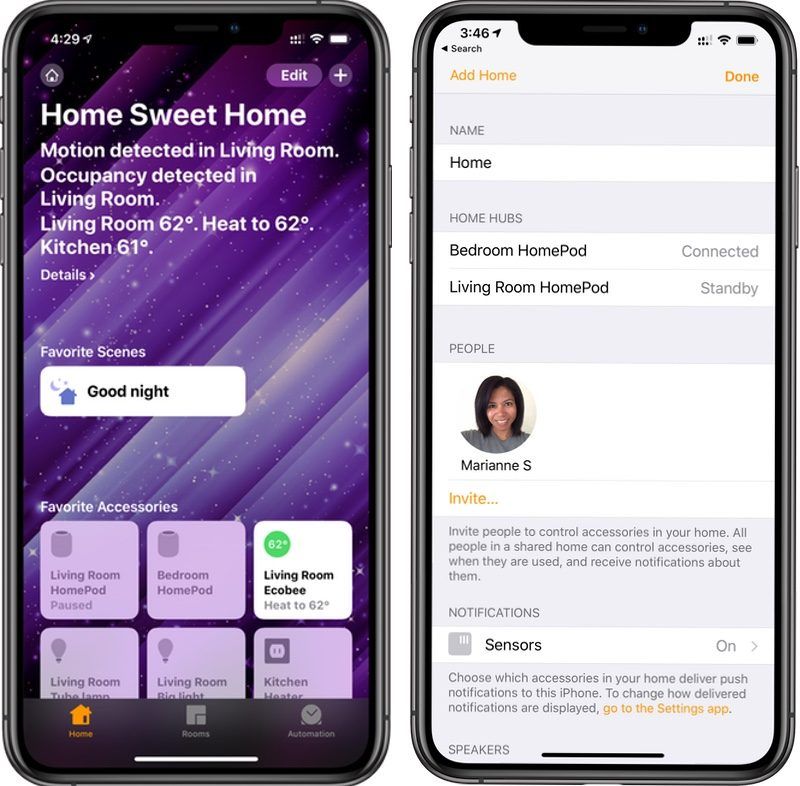 Если вы создали сцены — которые представляют собой наборы действий для одновременного запуска нескольких изменений, например, выключения всех источников света перед сном, — домашний концентратор также позволяет вам устанавливать их через «Siri», когда вы находитесь вдали от дома.