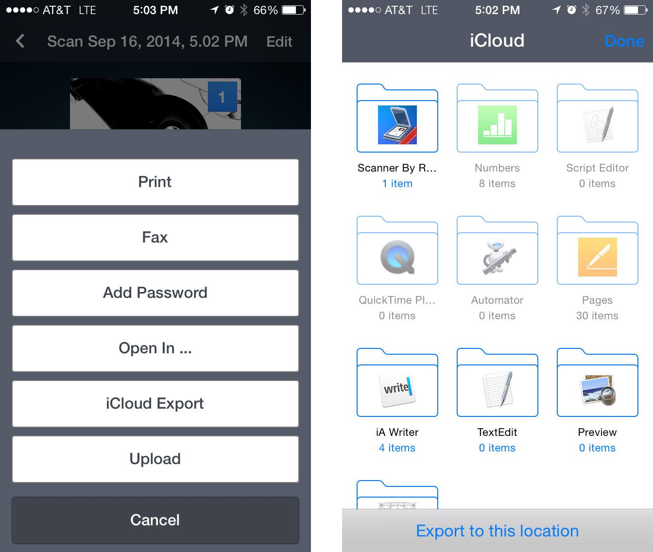Отличительной особенностью iCloud Drive для iOS является то, что он просто работает. Там нет ничего для вас, чтобы сделать или настроить. Пока вы входите в свою учетную запись iCloud Drive, любые приложения, поддерживающие iCloud Drive, будут предоставлять вам возможность открывать и сохранять в нем документы. В приведенном выше примере вы можете видеть, что вы можете не только сохранять документы и файлы на iCloud Drive из Scanner Pro, но и перемещаться по папкам и выбирать, где вы хотите их сохранить.