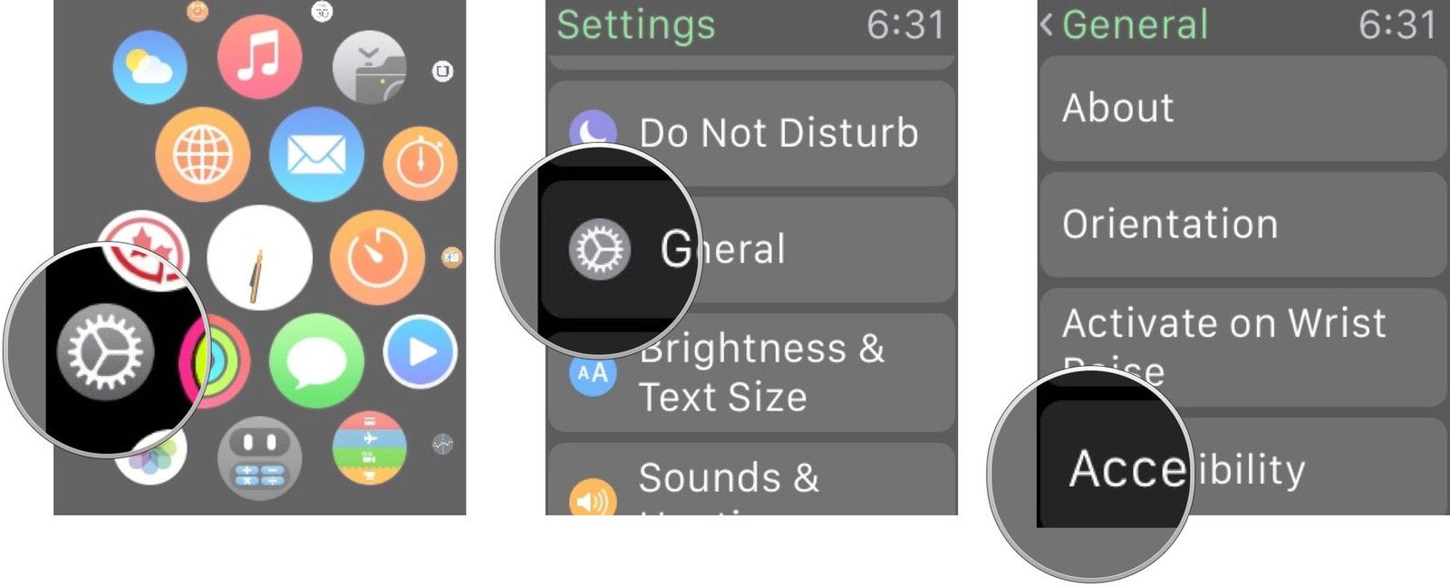 ![Запустите приложение Watch, нажмите «Общие», нажмите «Специальные возможности»]()