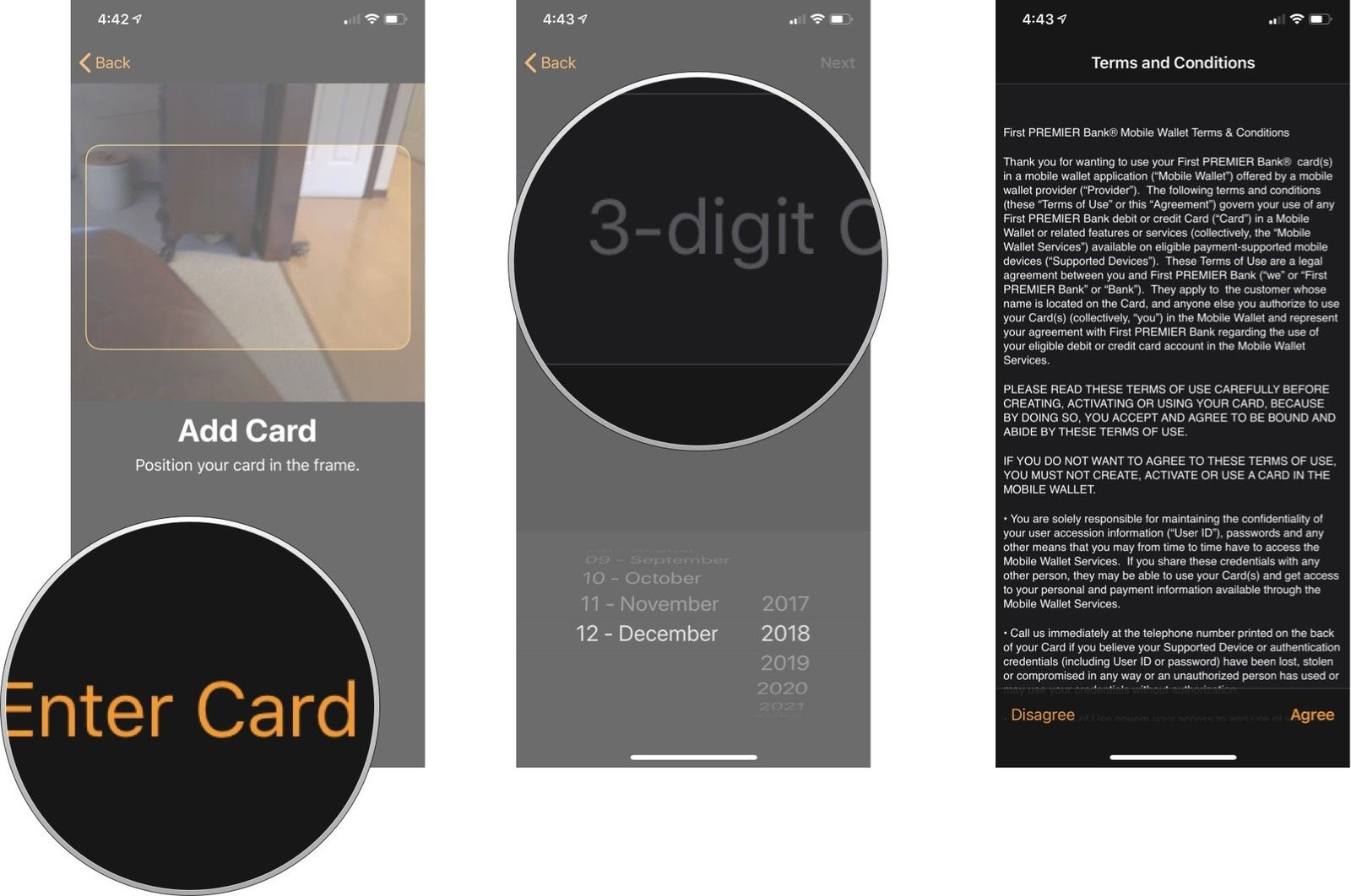 - Нажмите Введите данные карты вручную или поднесите iPhone к кредитной карте, чтобы отсканировать информацию.