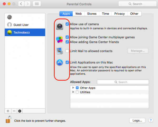 Имя пользователя ваших детей появится в левой боковой панели на панели Родительский контроль. Пока вы здесь, нажмите «Приложения» в верхней строке меню и управляйте ограничениями. Для детей до 9 лет я предлагаю вам снять все флажки, потому что они им не понадобятся, и вы также не позволите им присоединиться к нескольким играм.