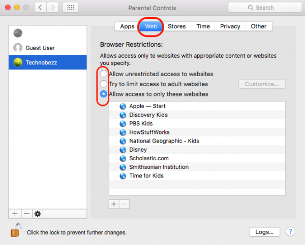 Выбрав «Веб» в верхней строке меню панели «Родительский контроль», вы сможете управлять ограничениями браузера для своих детей. Если вы установили новый Mac для своих детей до 6 лет,