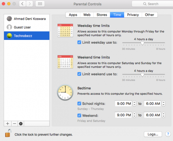 Вы можете установить, сколько часов дети могут использовать компьютер в будний день, выходные и запретить им доступ к MacBook во время сна. После того, как вы установите ограничения по времени, они не смогут использовать компьютер сверх установленного вами времени. На Родительском контроле, нажмите «Время» и установите его как хотите.