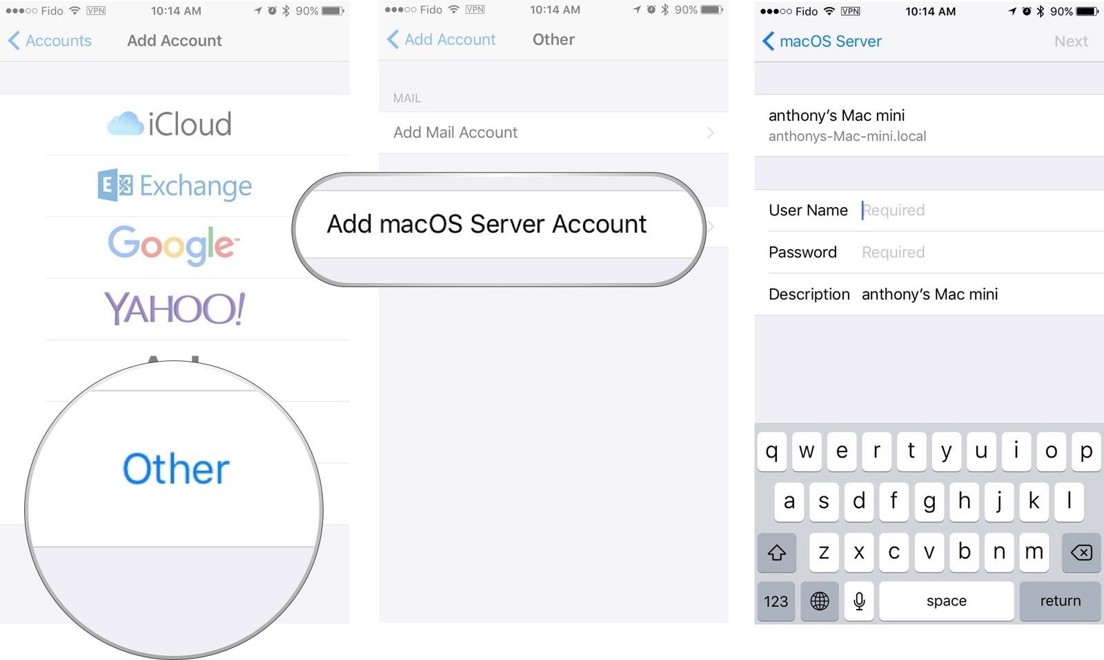 Введите ваш имя пользователя и пароль и нажмите следующий. Вам будет предложено принять сертификат идентификации сервера MacOS.