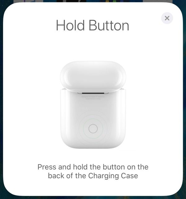 - Вам будет предложено нажать и удерживать кнопку «Назад» на корпусе «AirPods».