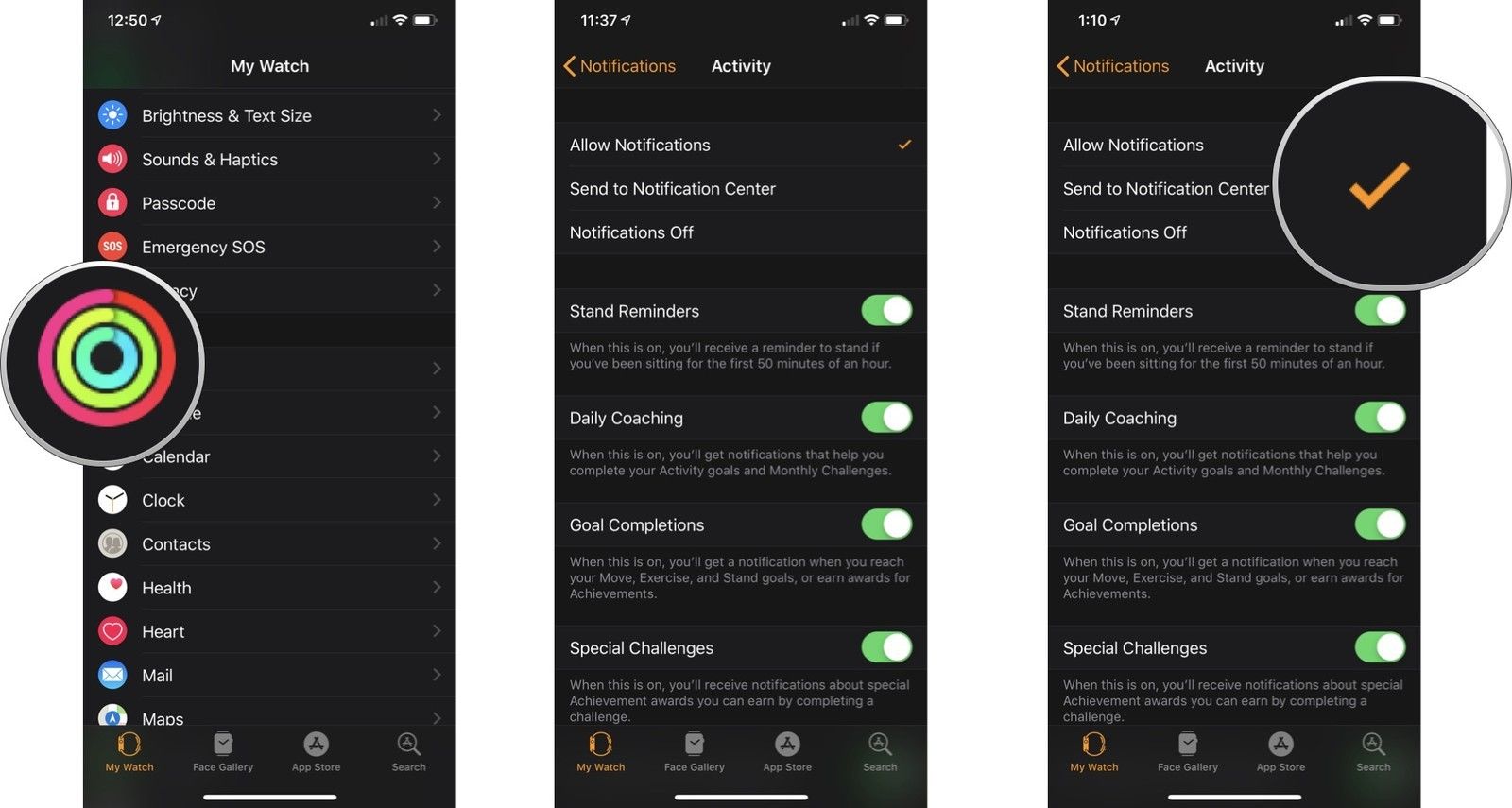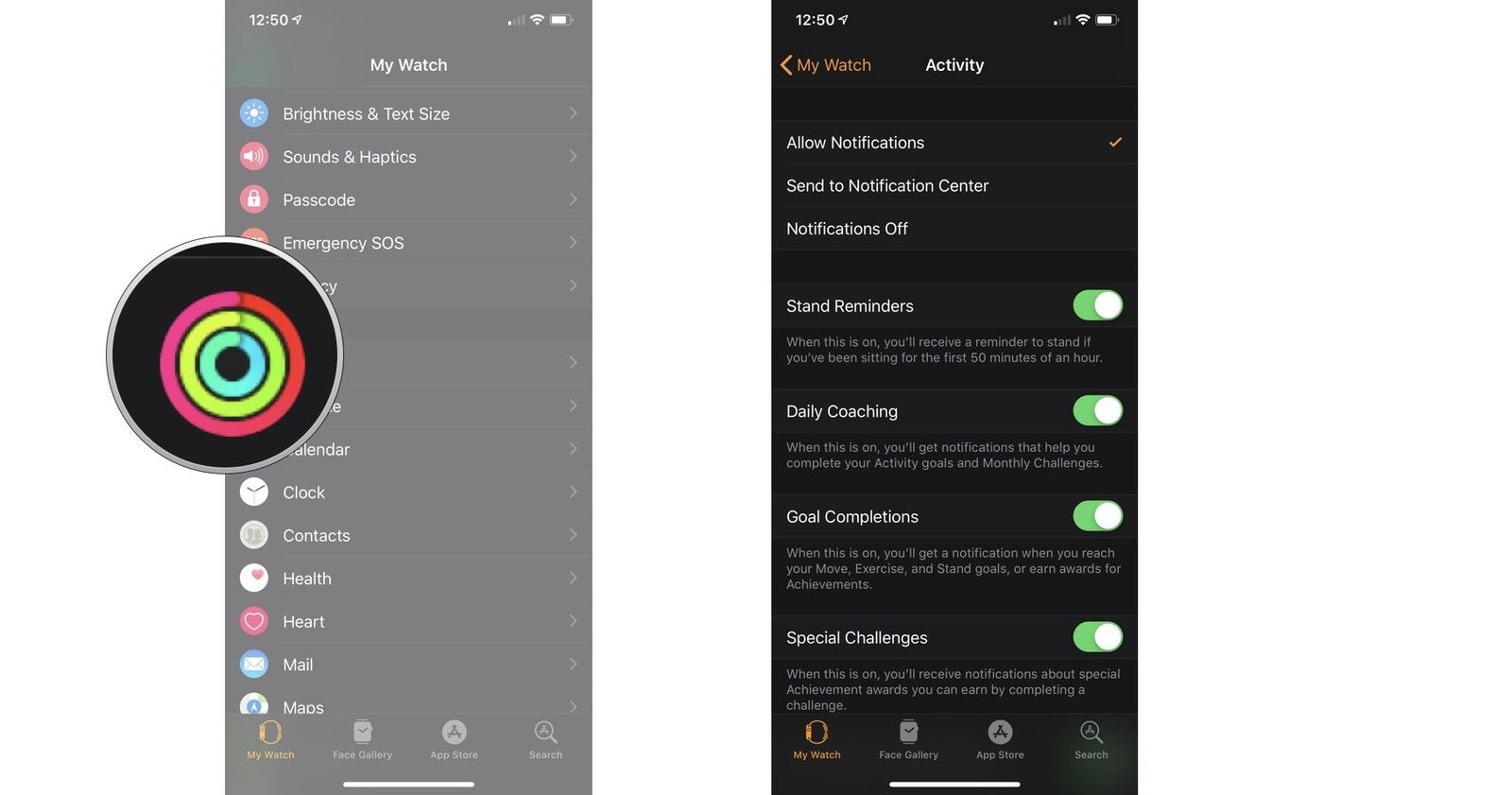 Вы можете настроить уведомления, которые вы получаете для вашей повседневной деятельности, чтобы соответствовать вашему повседневному образу жизни. Настройки находятся в приложении Watch на вашем iPhone. У вас есть три варианта, которые будут определять тип и расположение уведомлений приложения «Активность» на Apple Watch. К ним относятся: разрешить уведомления, отправить в центр уведомлений и отключить уведомления.