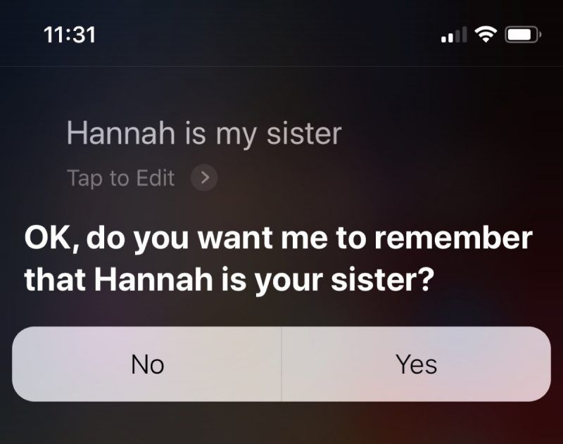 - Когда «Siri» спросит, хотите ли вы, чтобы оно помнило отношения, ответьте «Да» или нажмите да кнопка, которая появляется.