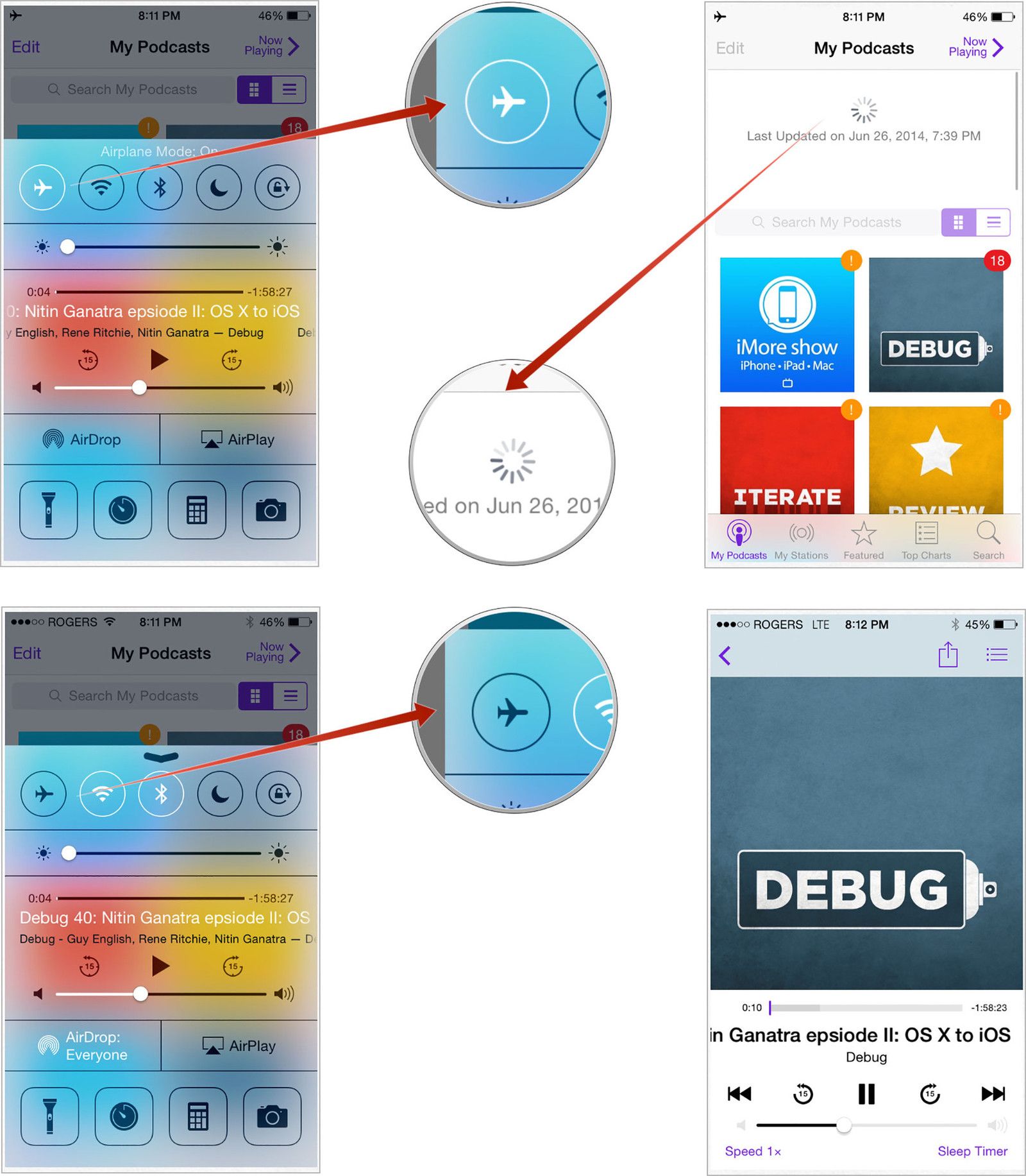 - Нажмите Авиа режим значок, чтобы отключить интернет-соединение (предположительно, чтобы предотвратить попытки подкастов связаться с iTunes).