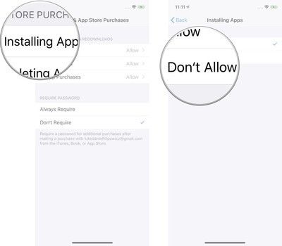 ![Нажмите на переключатель рядом с содержанием и конфиденциальностью's grey, tap iTunes & App Store Purchases and then tap Always Require]()