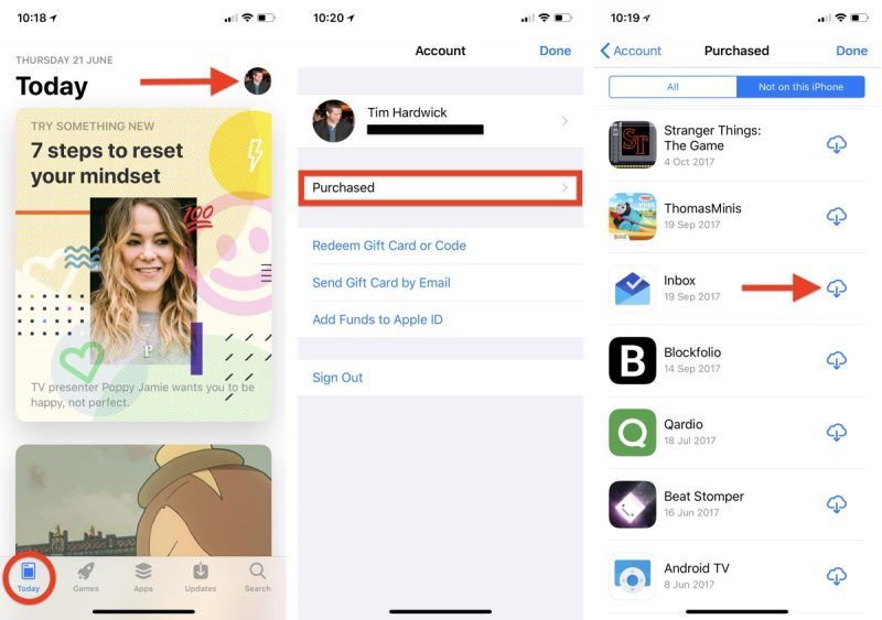 - Прокрутите список приобретенных приложений, чтобы найти то, которое вы хотите восстановить, и нажмите значок облачной загрузки рядом с ним, чтобы повторно загрузить и установить.