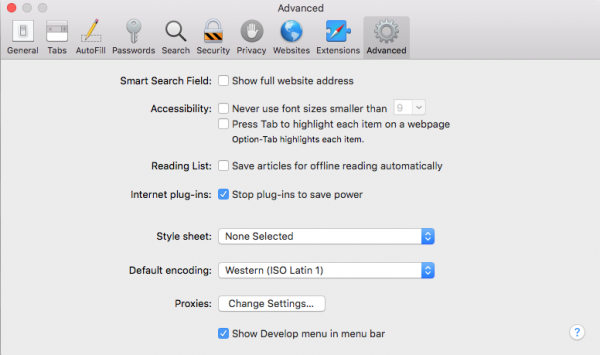 - Прежде всего, запустите навигатор Safari, затем нажмите «Настройки» и выберите «Дополнительно». В строке меню убедитесь, что «Показать меню разработки» включено.