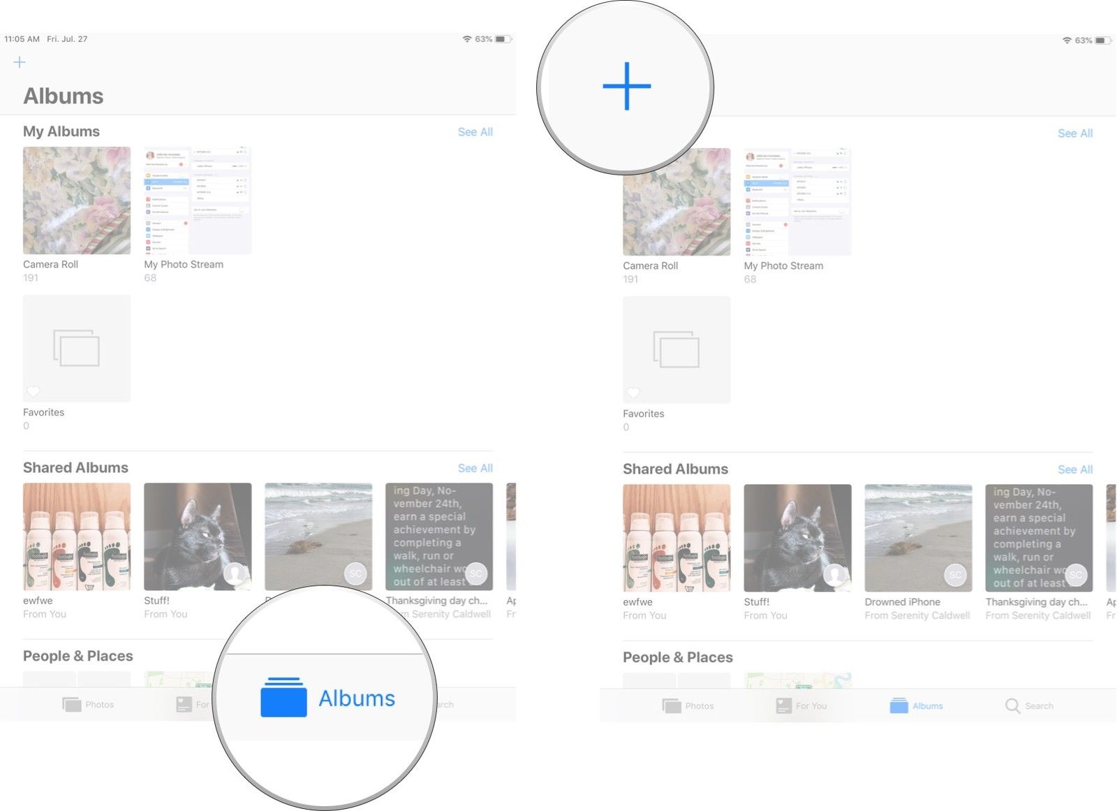 ![Откройте Фото, нажмите Альбомы, нажмите +]()