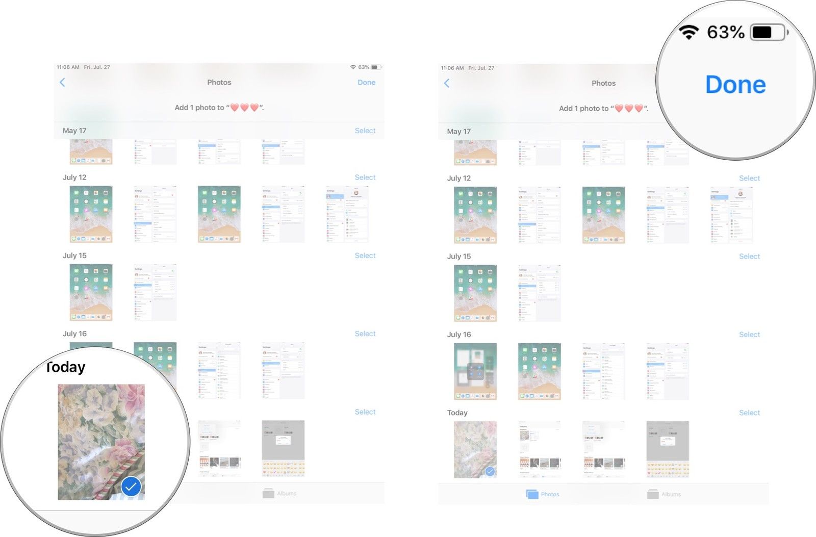 ![Нажмите +, нажмите фотографии, нажмите Готово]()