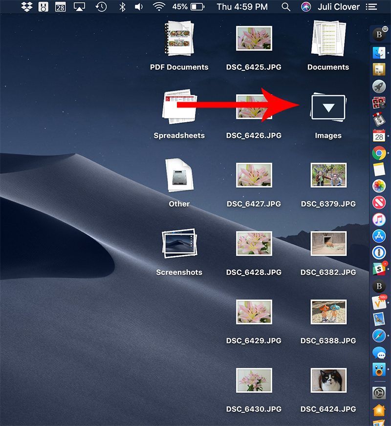 Включение стеков автоматически организует ваши файлы по типу файлов. Некоторые из доступных стеков включают документы, изображения, документы PDF, электронные таблицы и т. Д., А также снимки экрана.