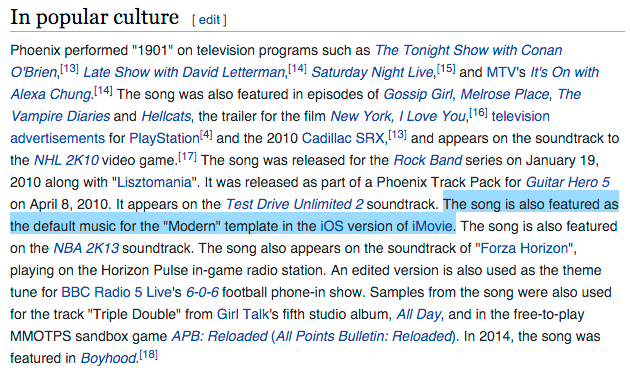 iMovie включает в себя несколько тем, и в первой версии программного обеспечения (тогда она называлась iMovie для iPhone) тема Modern использовала песню «1901» от Phoenix) вместо того, что создавала Apple. В соответствии с разделом 2.G лицензии Apple на использование iMovie (PDF):