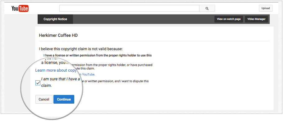- Подтвердите свой выбор на следующем экране, установив флажок «Я уверен, что у меня есть лицензия или письменное разрешение, и я хочу оспорить это утверждение». Нажмите Продолжить.