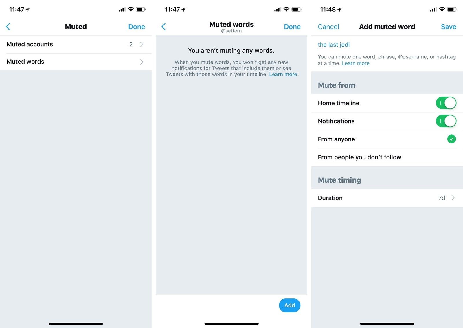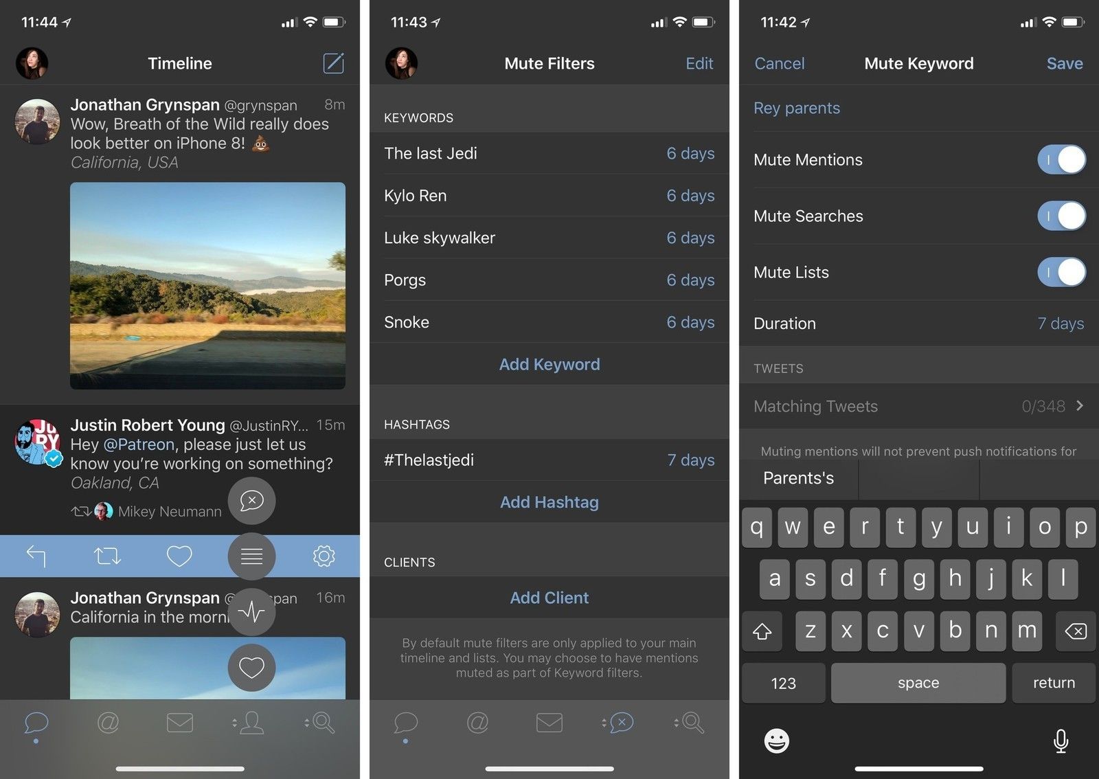 Если вы слишком сильно любите социальные сети (или вам нужно быть там, чтобы работать), чтобы полностью отказаться от них в течение нескольких дней, фильтры без звука — лучший способ. Вы можете отключить звук слов и пользователей из официального приложения Twitter; Tweetbot также позволяет отключать слова, фразы и хэштеги.