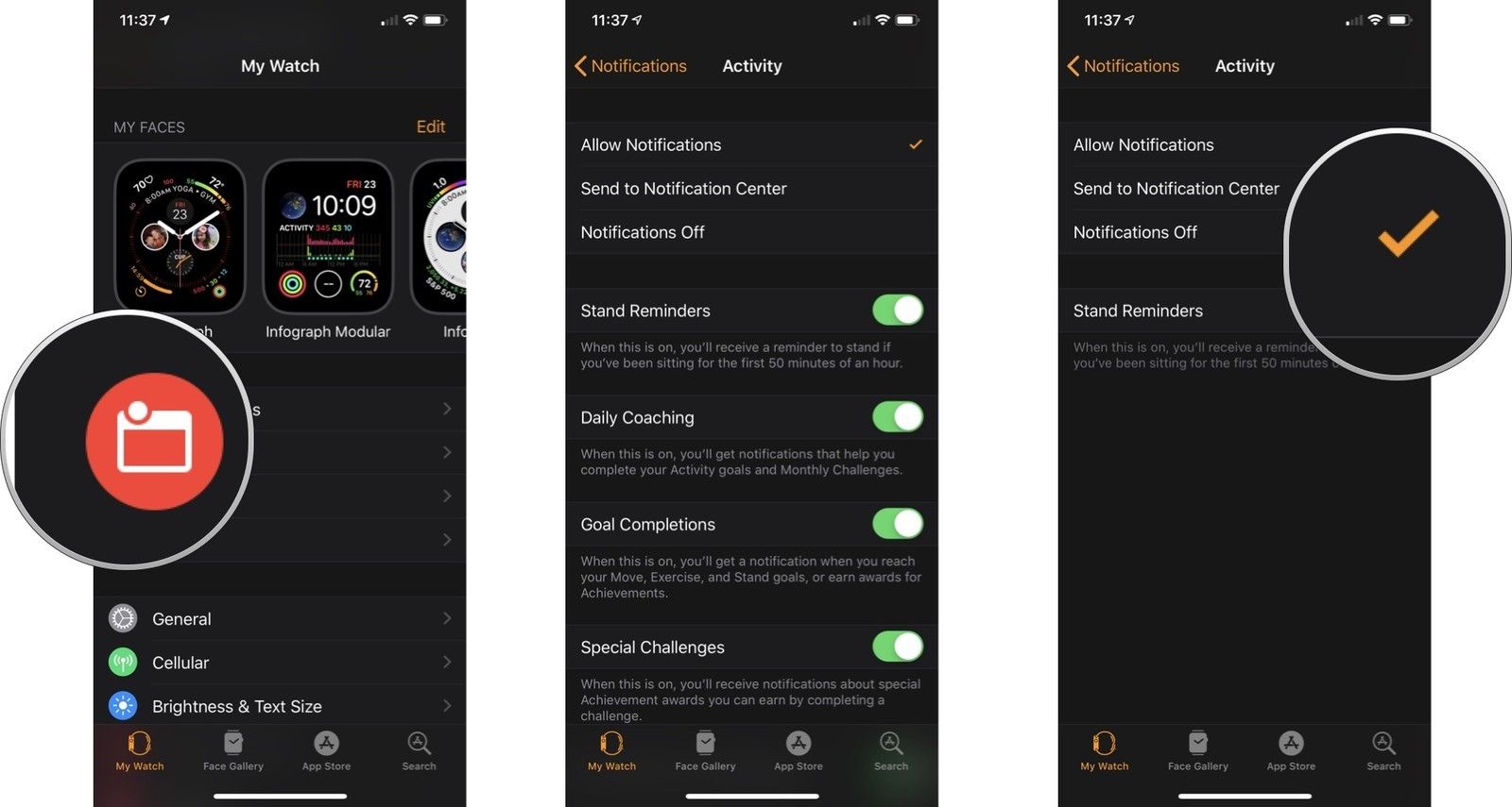 Некоторые приложения идут дальше и позволяют настраивать уведомления. Например, приложения «Активность» и «Дышать» позволят вам выбрать один из трех вариантов: «Разрешить уведомления», «Отправить в Центр уведомлений» и «Отключить уведомления».