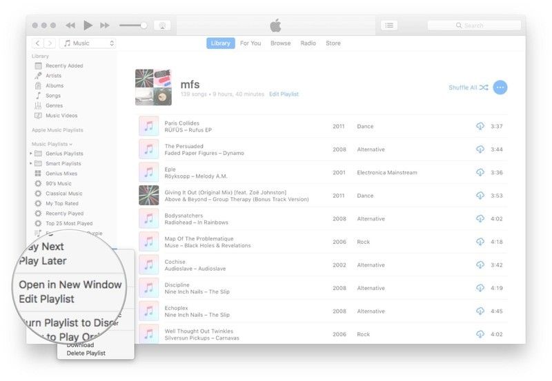 Щелкните правой кнопкой мыши или удерживайте нажатой клавишу «Control» в списке воспроизведения iTunes и выберите Открыть в новом окне.