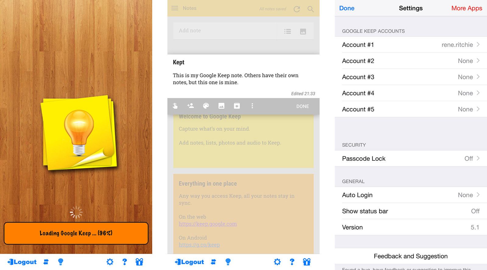 Благодаря поддержке размеров экрана iPhone 6 и iPhone 6 Plus и функциям iOS 8, таким как защита Touch ID, бесплатный TurboNote — и платный TurboNote Pro — оборачивает Google Keep в оболочку App Store. Дизайн тупой, с диковинным выбором шрифтов, устаревшими деревянными текстурами и логотипами с заметками, но функциональность солидна. Это включает в себя возможность добавить до 5 учетных записей Google — хранящихся в вашей цепочке для ключей — и быстро переключаться между ними.