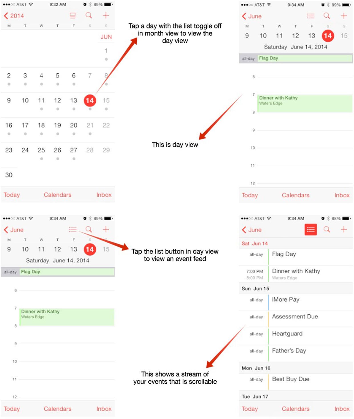 Встроенное приложение «Календарь» для iPhone дает вам несколько вариантов просмотра информации. Наиболее общий период времени — год, затем месяц, затем день и, наконец, представление отдельного события. Вы также можете переключить удобный просмотр списка, чтобы увидеть поток всех ваших событий, или просмотреть его под представлением месяца по умолчанию.