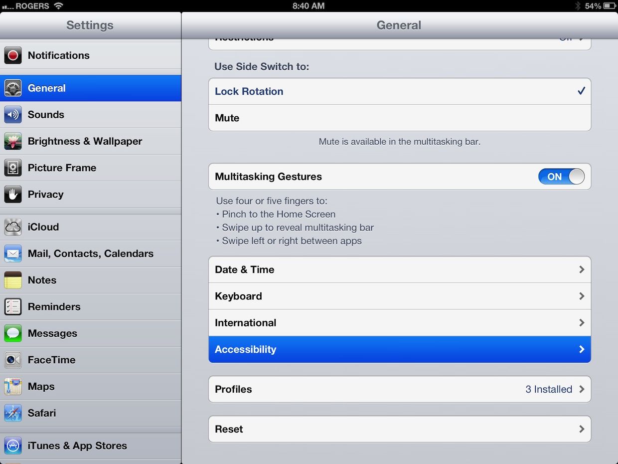 Примечание об ошибке: iOS 6 Guide Доступ к iPad в настоящее время содержит ошибку, которая приводит к повторному включению отключенных элементов управления при повороте устройства из портретного в альбомное или наоборот. Однако вы можете зайти в «Настройки» и сделать блокировку ориентации доступной только в быстром переключателе приложений (а не в переключателе аппаратного обеспечения сбоку), тем самым предотвращая возникновение этой ошибки. Надеюсь, Apple исправит это в следующем обновлении.