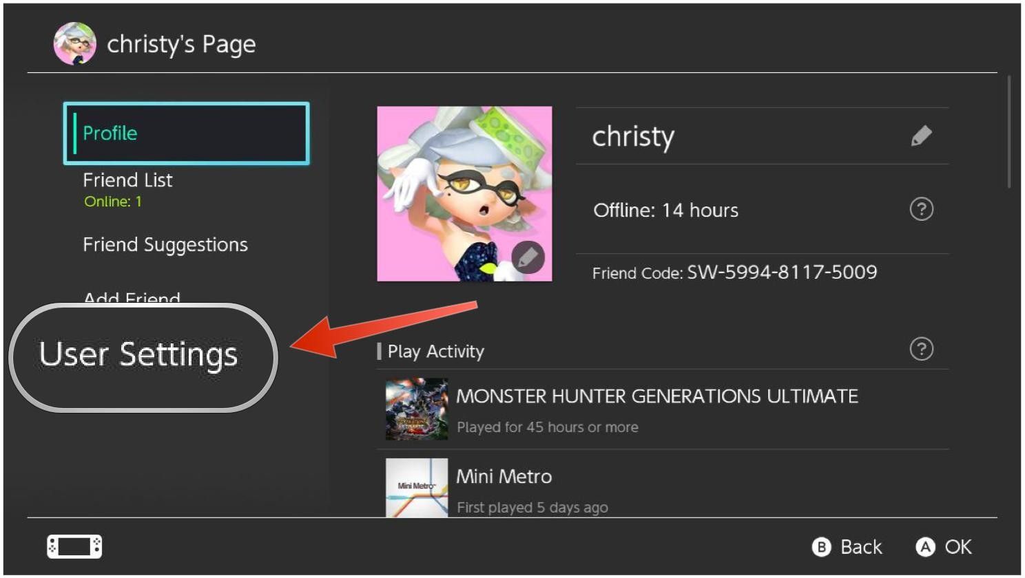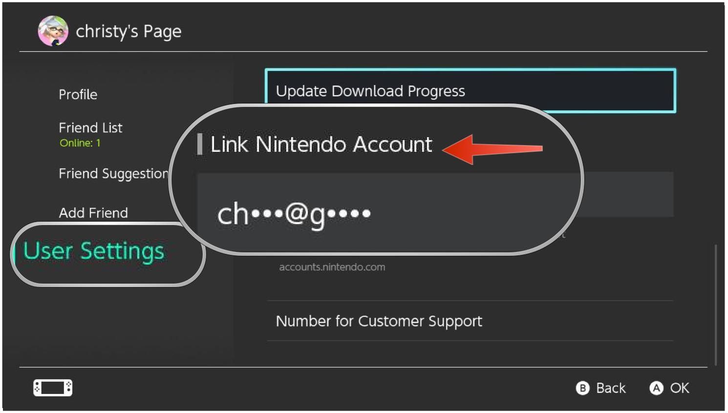 1. На Nintendo Switch перейдите к пользователю Моя страница, тогда Пользовательские настройки, а затем выберите Ссылка на учетную запись Nintendo. Если у вас уже есть связанный аккаунт, вместо этого вы увидите адрес электронной почты, связанный с аккаунтом.