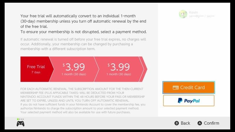 - Вам нужно будет ввести способ оплаты, чтобы начать пробную версию, так как Nintendo автоматически выставит вам счет, когда пробный период закончится. Это можно сделать с помощью кредитной карты, PayPal или средств на кошельке, уже находящихся на вашем счете.