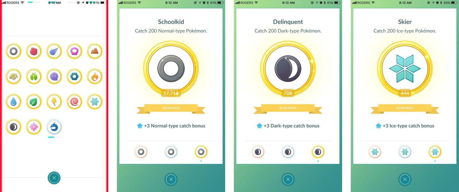 Медальные бонусы работают по типу. С каждым типом связана своя медаль, и вы получаете медали типа за поимку большого количества каждого типа: