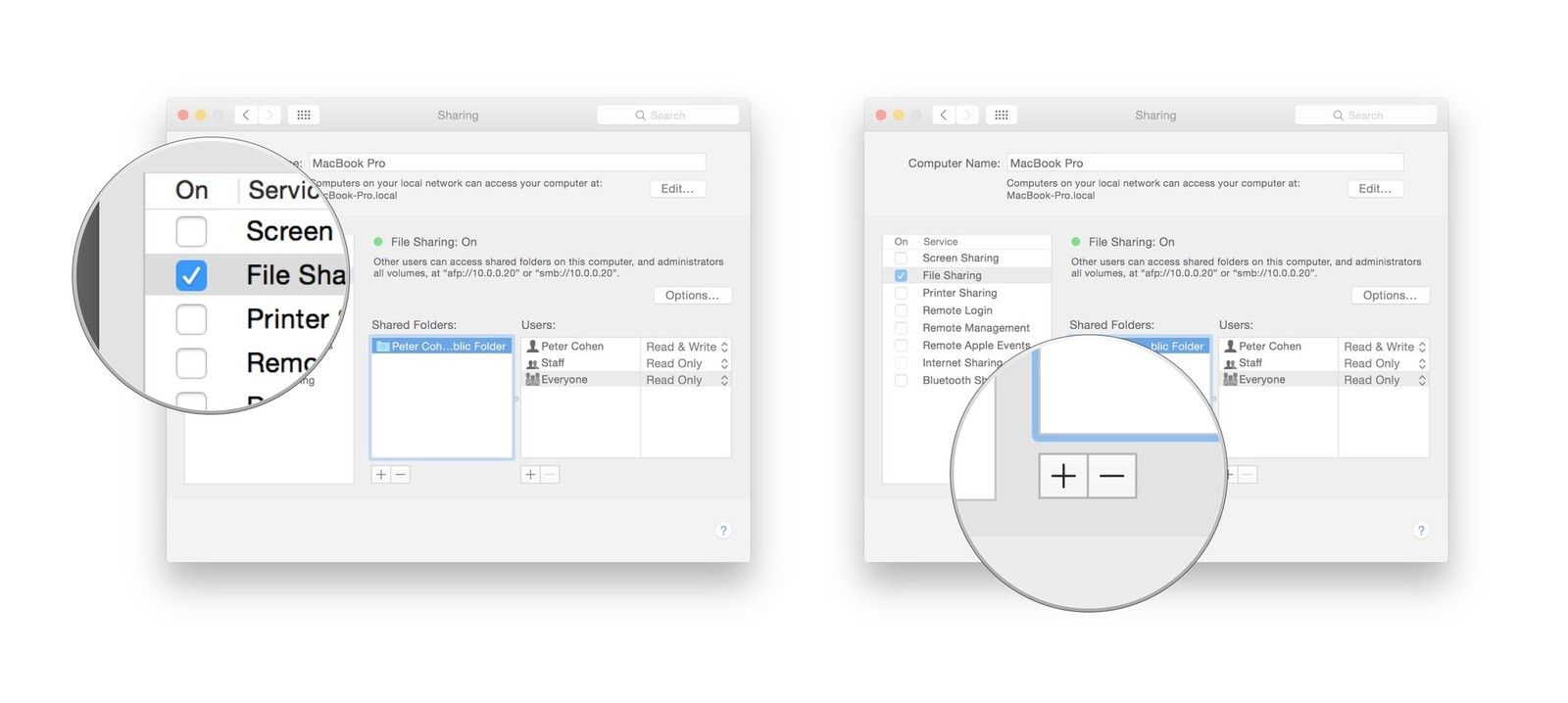 - Нажмите на кнопку + под пользователей указать конкретных пользователей для обмена файлами с. Вы можете указать, хотите ли вы, чтобы у них был доступ для чтения и записи (чтобы они могли отправлять вам файлы), только для чтения (чтобы они могли копировать файлы от вас) или доступ только для записи (чтобы они могли перетаскивать файлы вам в указанный папку, но не вижу, что внутри.