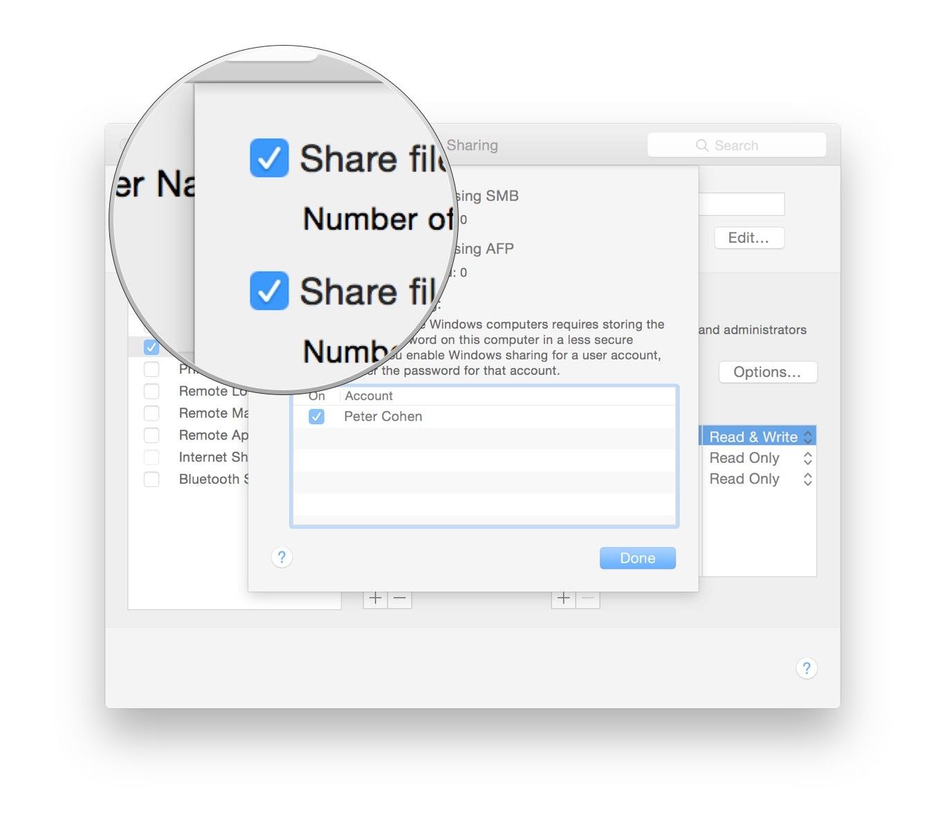 - Параметры Кнопка позволяет вам обмениваться файлами, используя SMB, общий протокол обмена файлами Windows и AFP, или Apple Filing Protocol, устаревшую технологию, поддерживаемую на некоторых старых Mac.