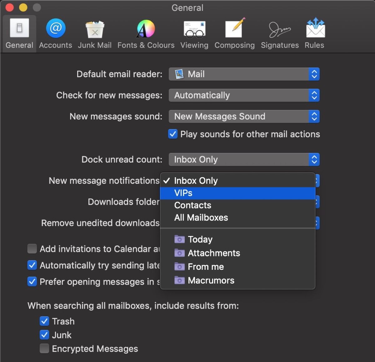 В родном почтовом приложении в macOS стандартным способом получения уведомлений о новых сообщениях от VIP-пользователей является вход в Mail. предпочтения и выберите VIP в Уведомления о новых сообщениях раскрывающийся список.