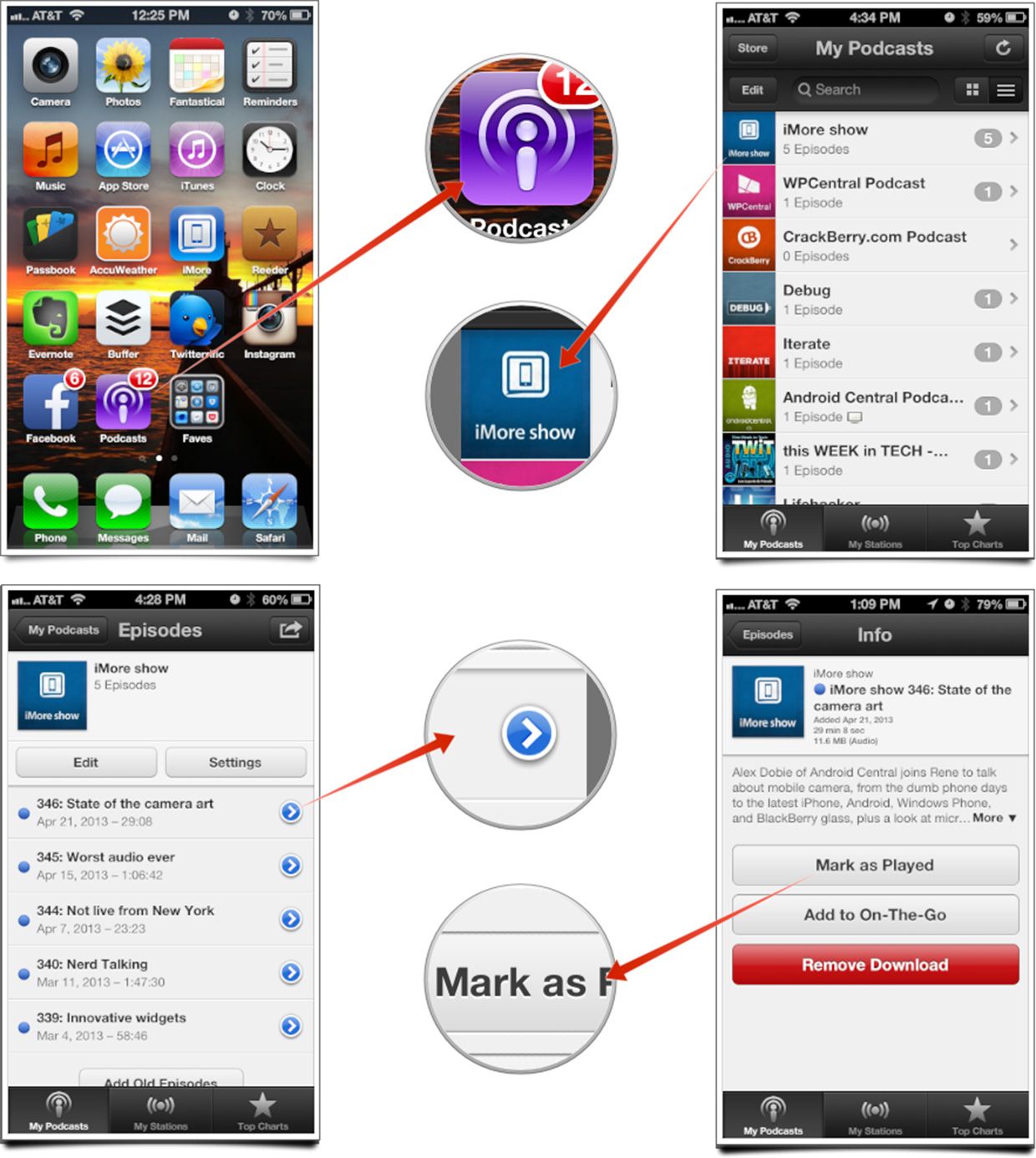 - Нажмите на синяя стрелка рядом с названием подкаста, который вы хотите отметить как проигранный.
