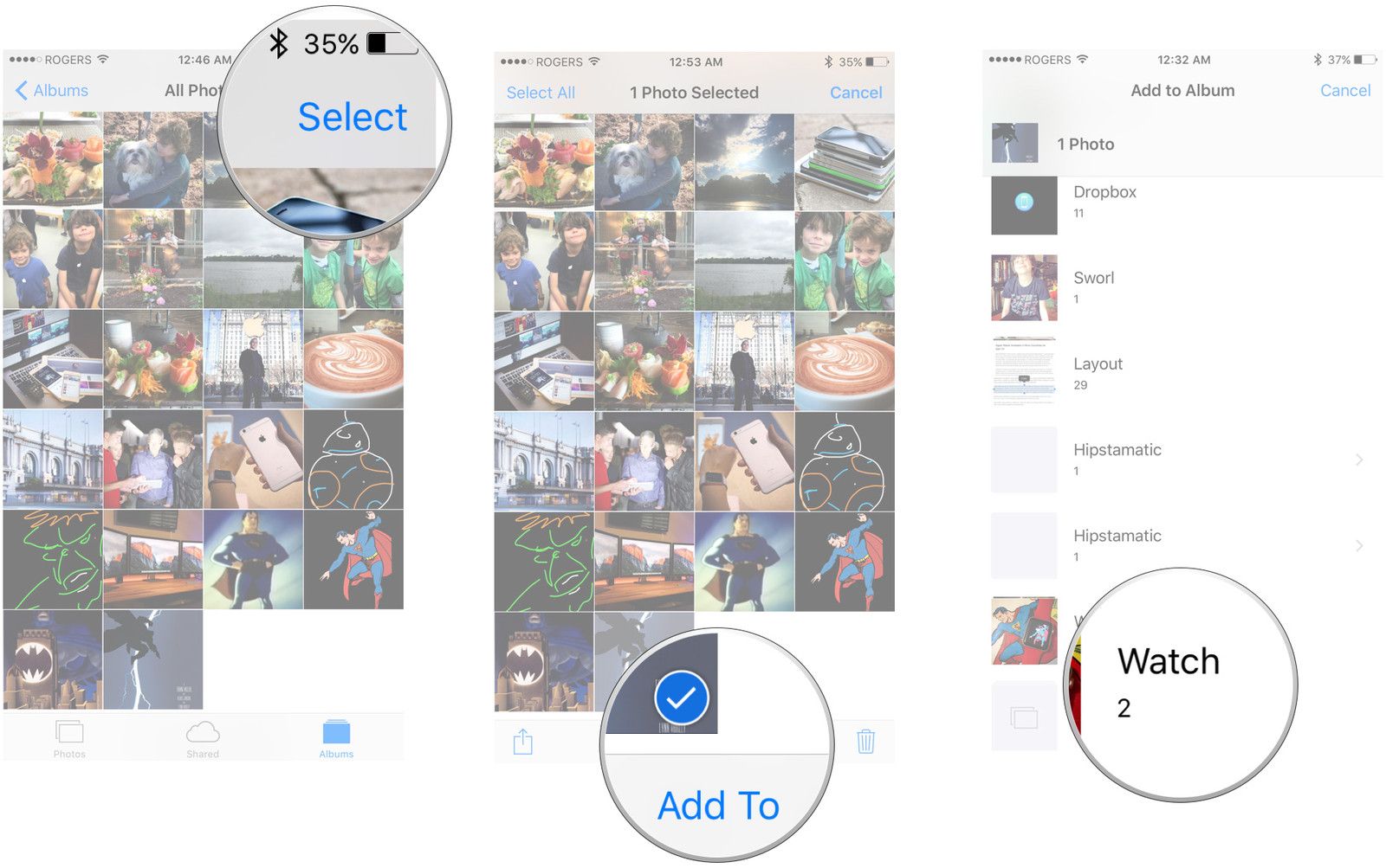 - В противном случае нажмите Выбрать, выберите изображение, нажмите добавить в, а затем нажмите на альбом Вы синхронизируете свои Apple Watch.