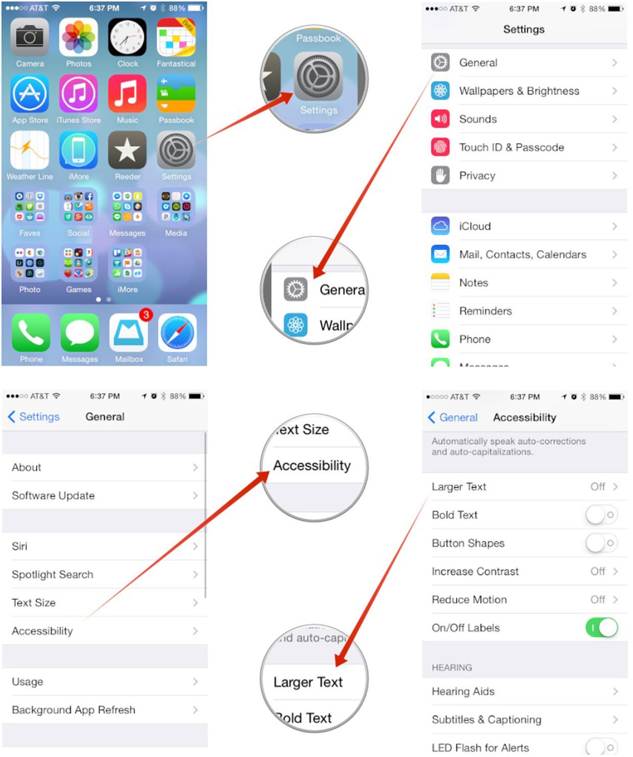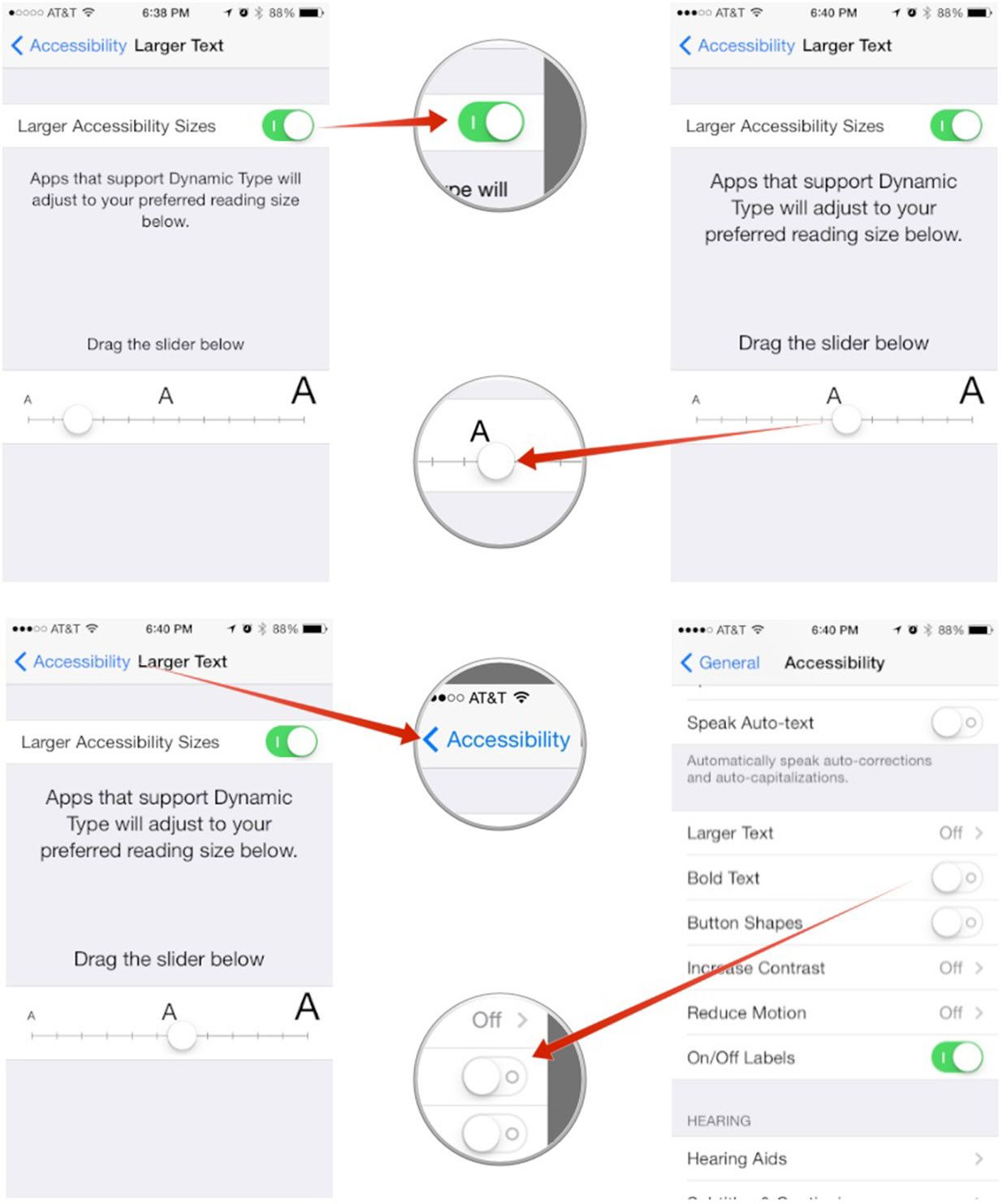 Большой и жирный текст — это функция доступности, которая помогает улучшить разборчивость за счет использования движка динамического типа iOS, чтобы сделать шрифты больше и / или тяжелее, и, как правило, их легче читать. Для людей со слабым зрением увеличение текста может увеличить слова без увеличения элементов интерфейса. Для людей, которым требуется больше контраста, выделение жирным шрифтом текста может превратить тонкие, плохо различимые линии в более толстые и легко видимые линии. Применение большого или жирного текста в iOS сделает текст больше и ярче во всех приложениях Apple, а также в любых приложениях App Store, которые поддерживают платформу динамического типа.