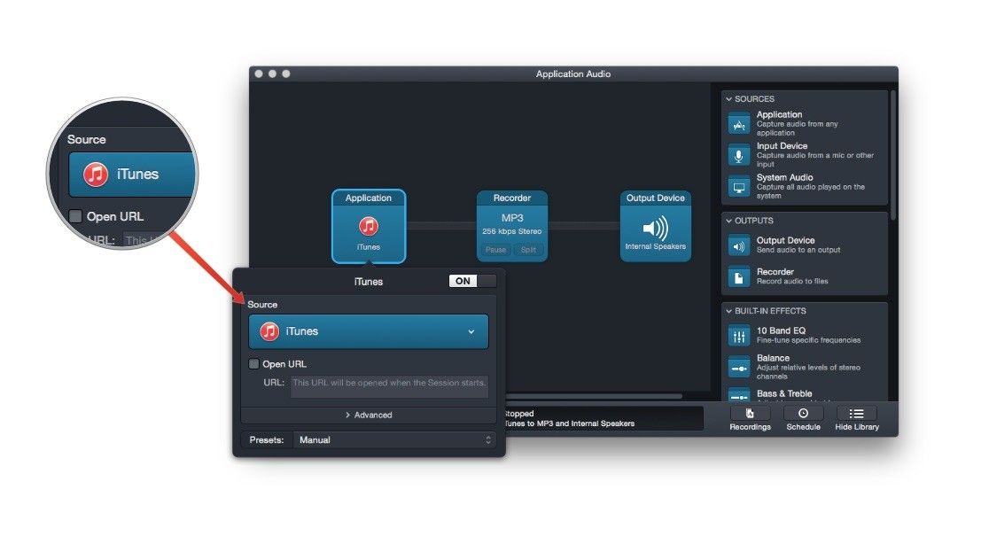 - Дважды щелкните блок приложения, чтобы выбрать приложение для записи. (По умолчанию выбран iTunes.)