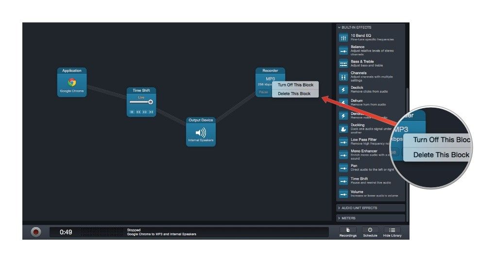 Если вы просто хотите использовать Time Shift для его перемотки и не хотите записывать конечный продукт, просто щелкните правой кнопкой мыши блок Recorder, чтобы удалить или отключить его для вашей сессии.