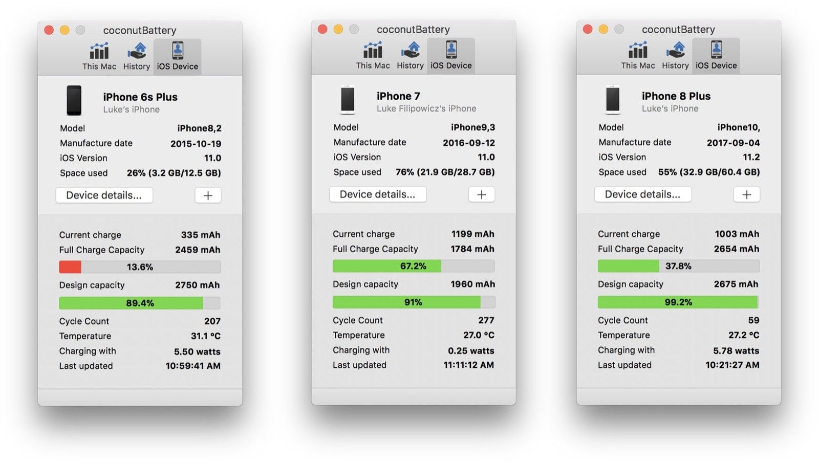 На картинке выше вы можете увидеть результаты сканирования моего iPhone 6s Plus, iPhone 7 и iPhone 8 Plus с помощью coconutBattery.