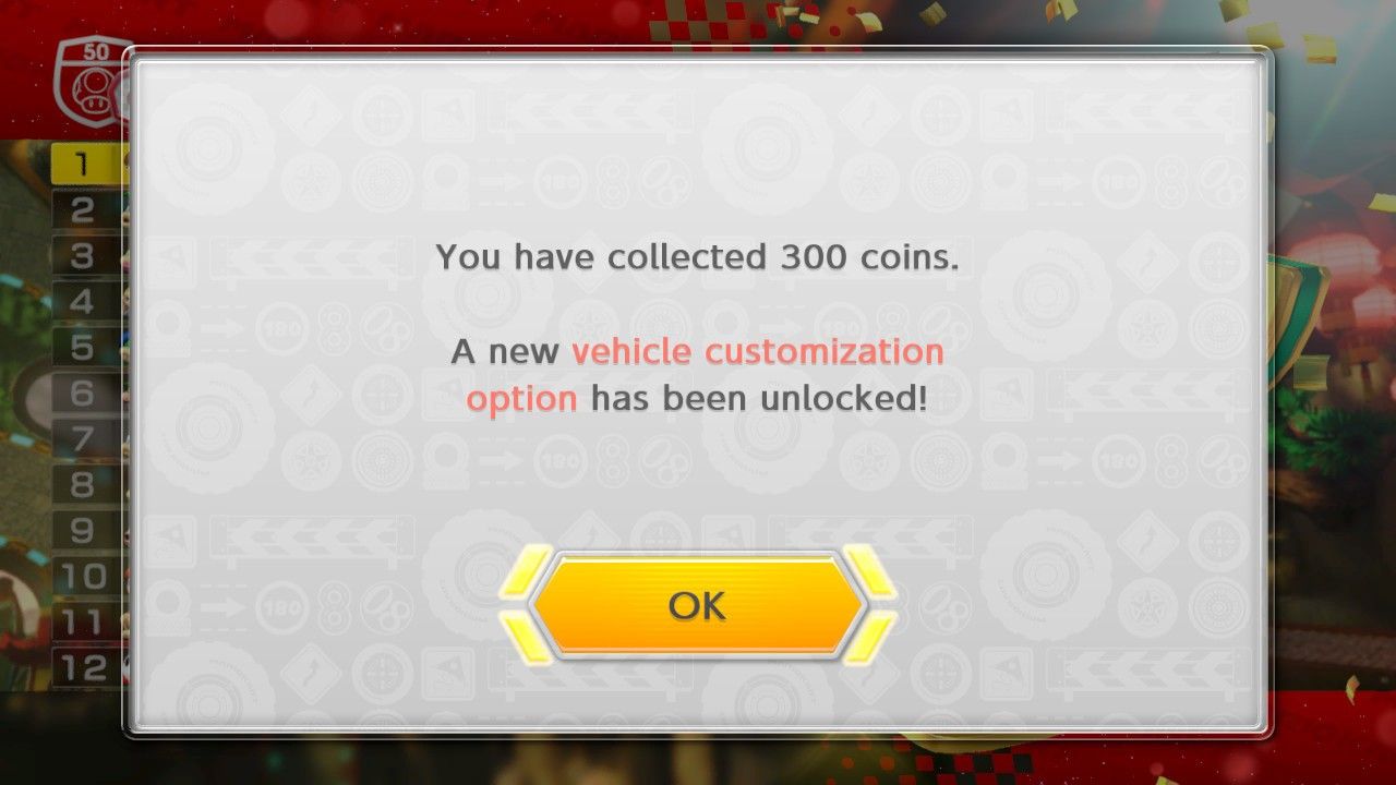 Чтобы разблокировать больше картов, шин и планеров, вам нужно участвовать в гонках в режиме Grand Prix для одного игрока. Во время каждой гонки Кубка с четырьмя курсами в Гран При у вас есть возможность собрать до десяти монет, прежде чем пересечь финишную черту. Если вы собрали 30 или более монет к концу Кубка, новый предмет будет доступен для использования в вашей следующей гонке.