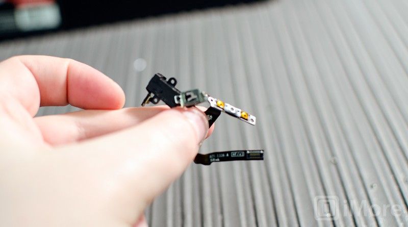 - Теперь у нас есть все компоненты, подключенные к наушникам и гибкому кабелю выключателя звука. Отсюда мы можем теперь осторожно подтянуть кабель и полностью удалить его из устройства.