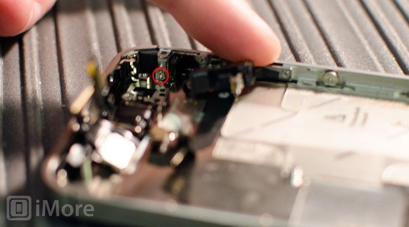 - Используя ваш # 00 крестовая отвертка Снимите экран, который закрывает кабель разъема док-станции в направлении средней левой части iPhone. Помните, какой винт пришел откуда, как они находятся различных размеров. Аккуратно вытащите экран из iPhone и отложите его в сторону.