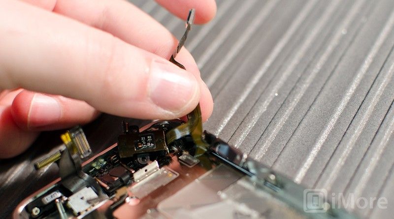 - Опять же, используя пинцет или инструмент для подглядывания осторожно вытащите разъем для наушников из вашего iPhone 4S. Он по-прежнему прикреплен, поэтому вам нужно будет только сместить его с центрального блока.