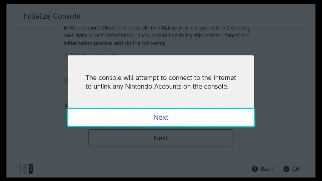 Затем ваш коммутатор подключится к Интернету, чтобы отменить регистрацию вашей системы в качестве активной консоли для загрузки вашей учетной записи Nintendo. Выбрать следующий.