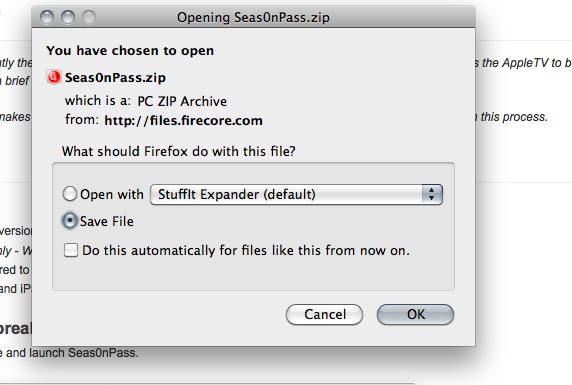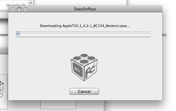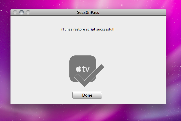 - Seas0nPass распознает, что ваш Apple TV находится в режиме DFU, и сделает все остальное самостоятельно. Вы увидите, как он открывается и восстанавливается в iTunes, и перейдите к самому пакету микропрограмм, который он создал.