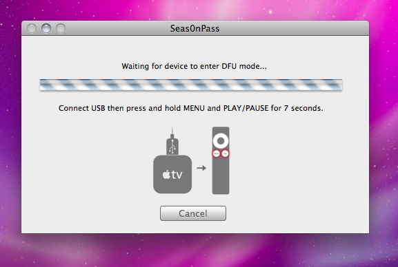 - Seas0nPass предложит вам подключиться через USB и снова включить Apple TV в DFU, как и ранее.