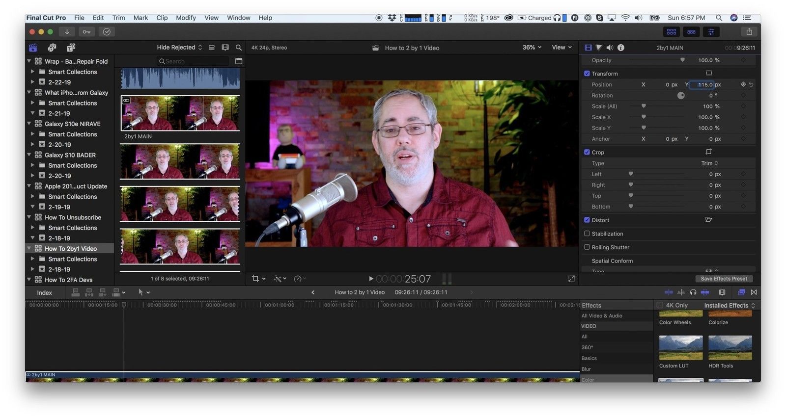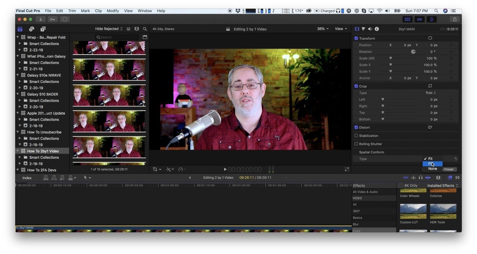 Теперь, если вы снимаете в формате 16: 9, как я, вам нужно сначала переоснастить его. Просто зайдите в видеоинспектор, найдите Spatial Conform: напечатайте внизу и измените раскрывающийся список с подгонки к заполнению. Это мгновенно увеличит масштаб и выбьет ящики с колоннами.