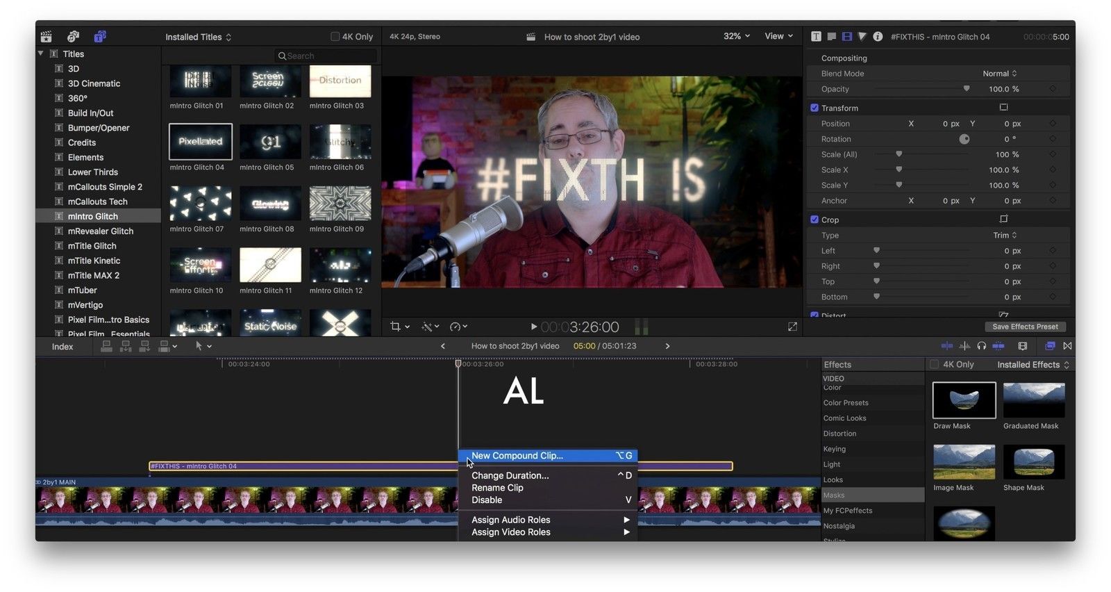 Конечно, вы можете избежать использования этих клипов или пропинговать создателя или компанию, которая их делает, и посмотреть, сможете ли вы обновить их. Но, если вы не возражаете запачкать руки, вы также можете открыть эффект в Motion, редакторе движущейся графики Apple, настроить их на 2: 1 и сохранить обратно. Я все еще пытаюсь понять Motion, но если вы уже профессионал, вы можете заставить любой эффект делать практически все, что вы хотите, в любое время.