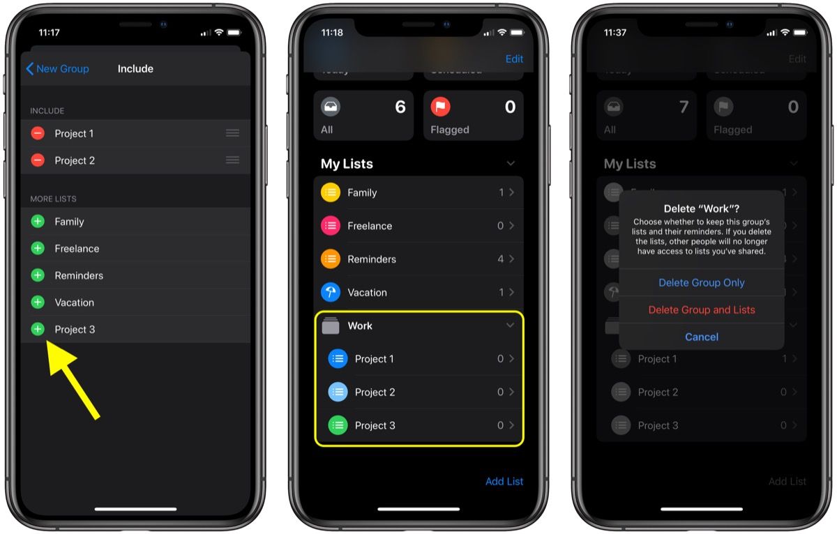 После того, как Apple обновила свое мобильное приложение Reminders в iOS 13, теперь вы можете сгруппировать отдельные списки напоминаний под одним заголовком, чтобы сделать раздел «Мои списки» более компактным и аккуратным.